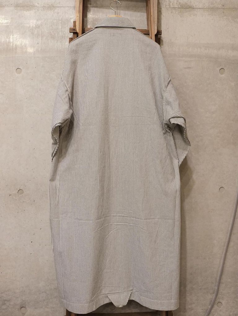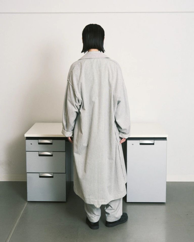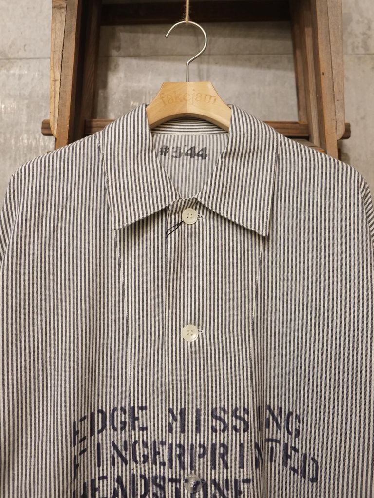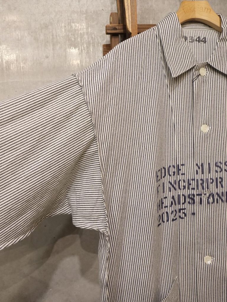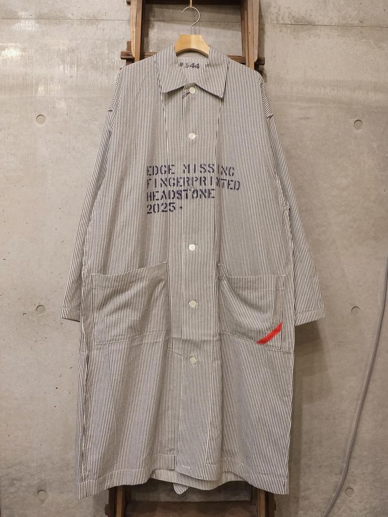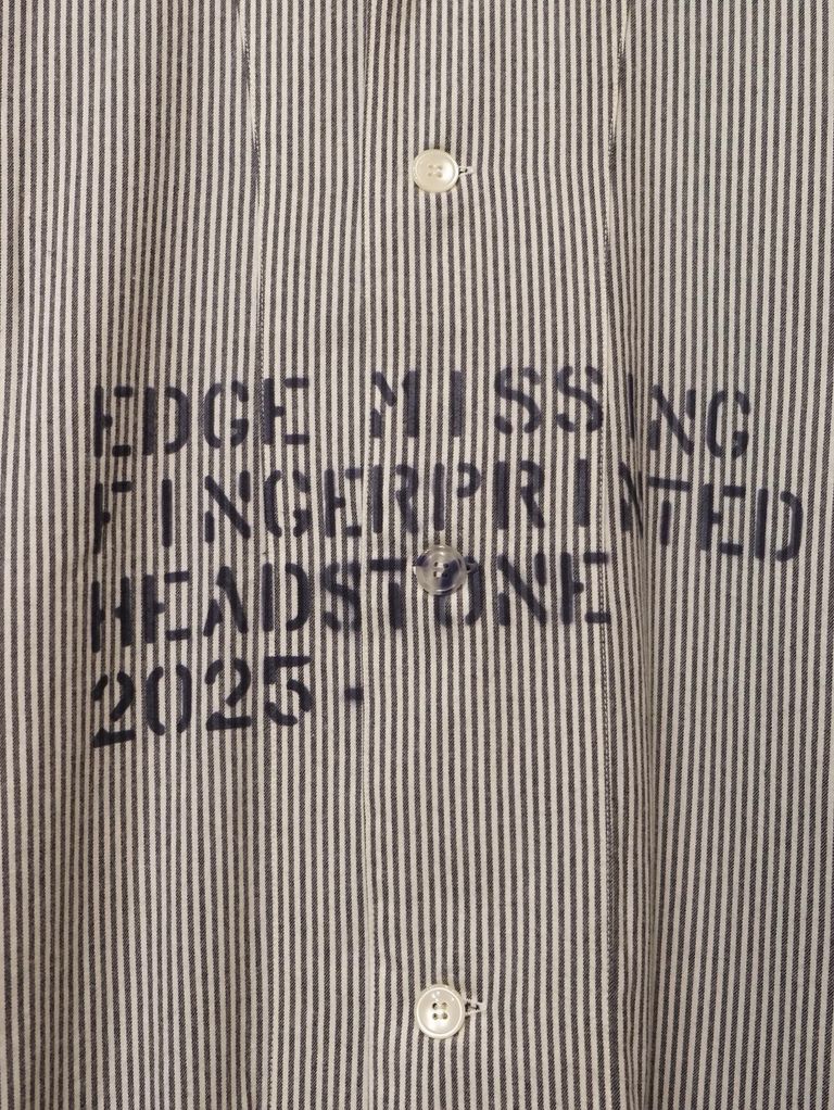 PHINGERINのアイコンをミリタリー風のテキストで言語化した、EMFHの文言がステンシルアーティストRyusuke Marumeによるハンドスプレープリントされています。ストローク、 ポケット形、蓄光ハートボタンなど、PHINGERINのデザインステートメントが詰まったオリジナルパジャマスリーパー(ワンピースパジャマ、少しコージーな雰囲気のスモーキーなストライプ生地です