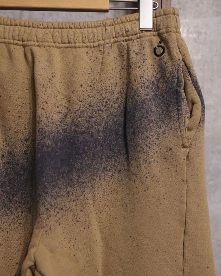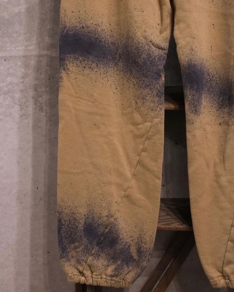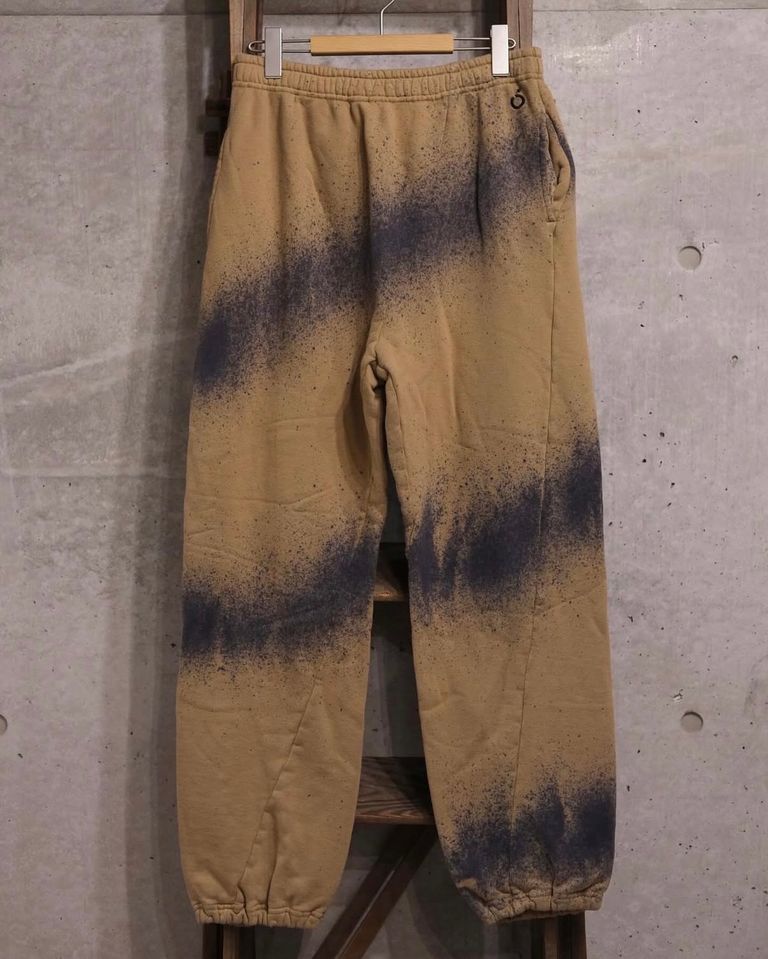 製品染めをし手作業で抜染を行い更に抜染した場所に別の色を手作業で染色を施した、ツイストパターンのスウェットパンツです。