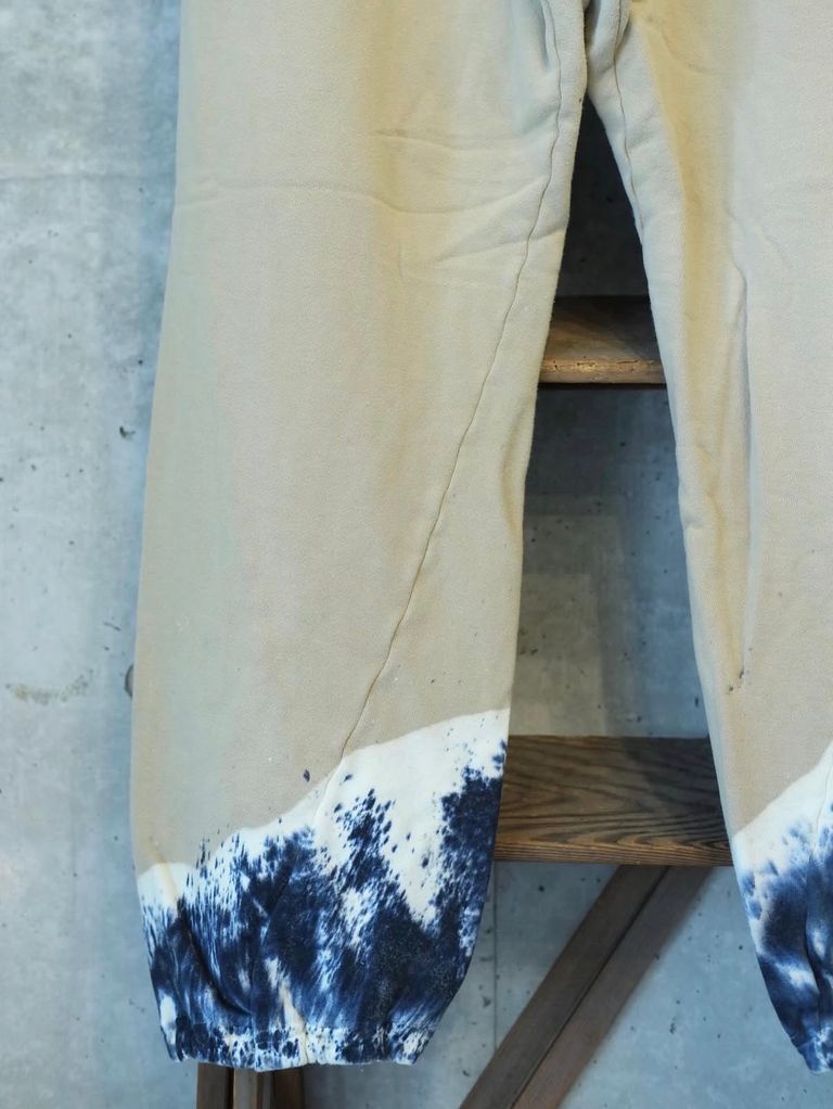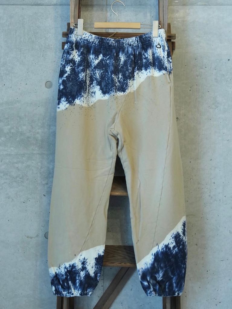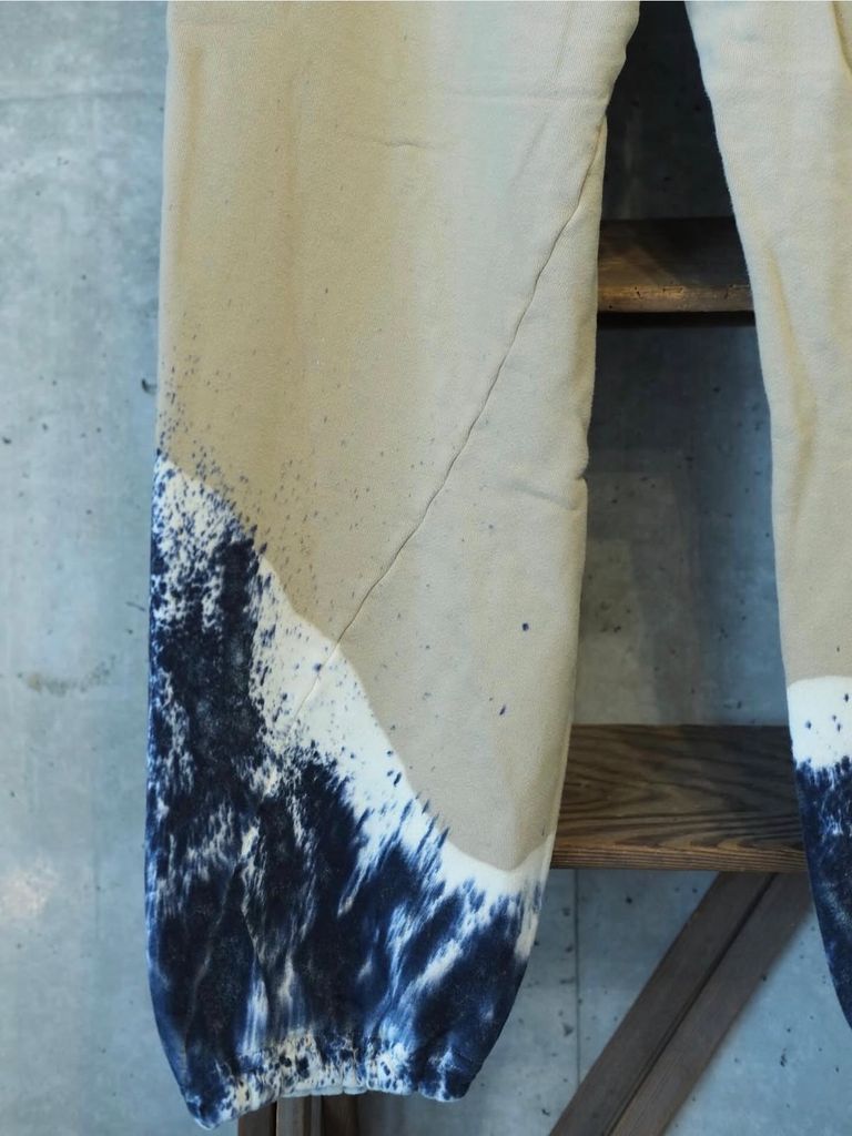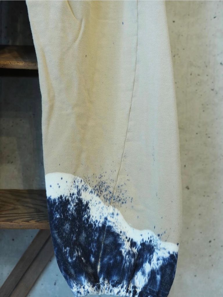 製品染めをし手作業で抜染を行い更に抜染した場所に別の色を手作業で染色を施した、ツイストパターンのスウェットパンツです。