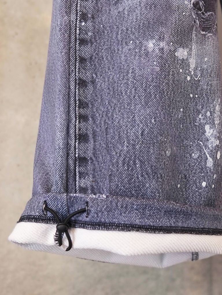 素材にはドレープ感のあるコンパクト裏毛を使用し、見た目の重厚なデニムの印象とは対照的に、軽やかで柔らかな穿き心地を実現。この視覚と触覚のギャップも、本アイテムならではの魅力です。