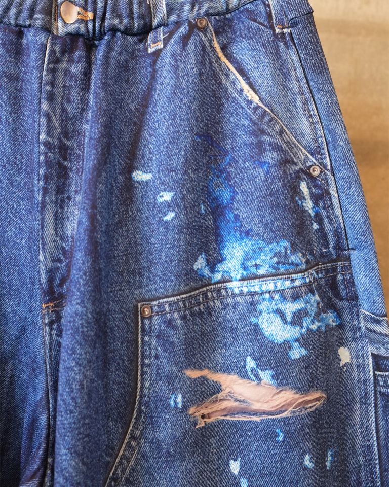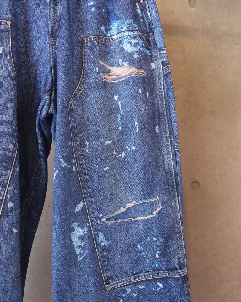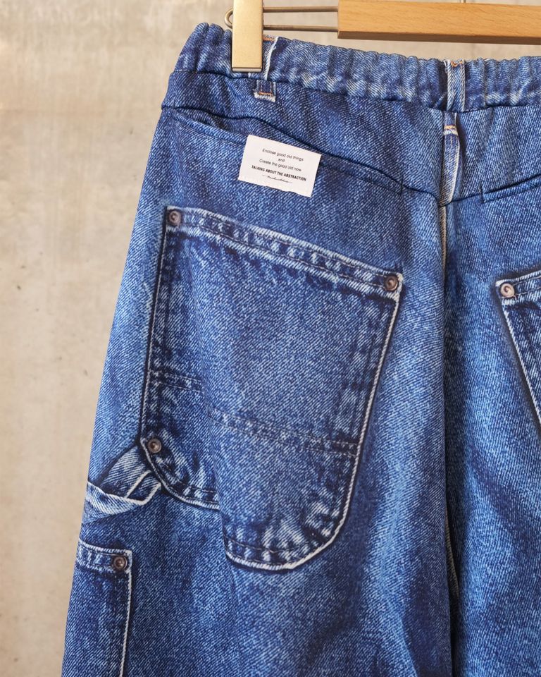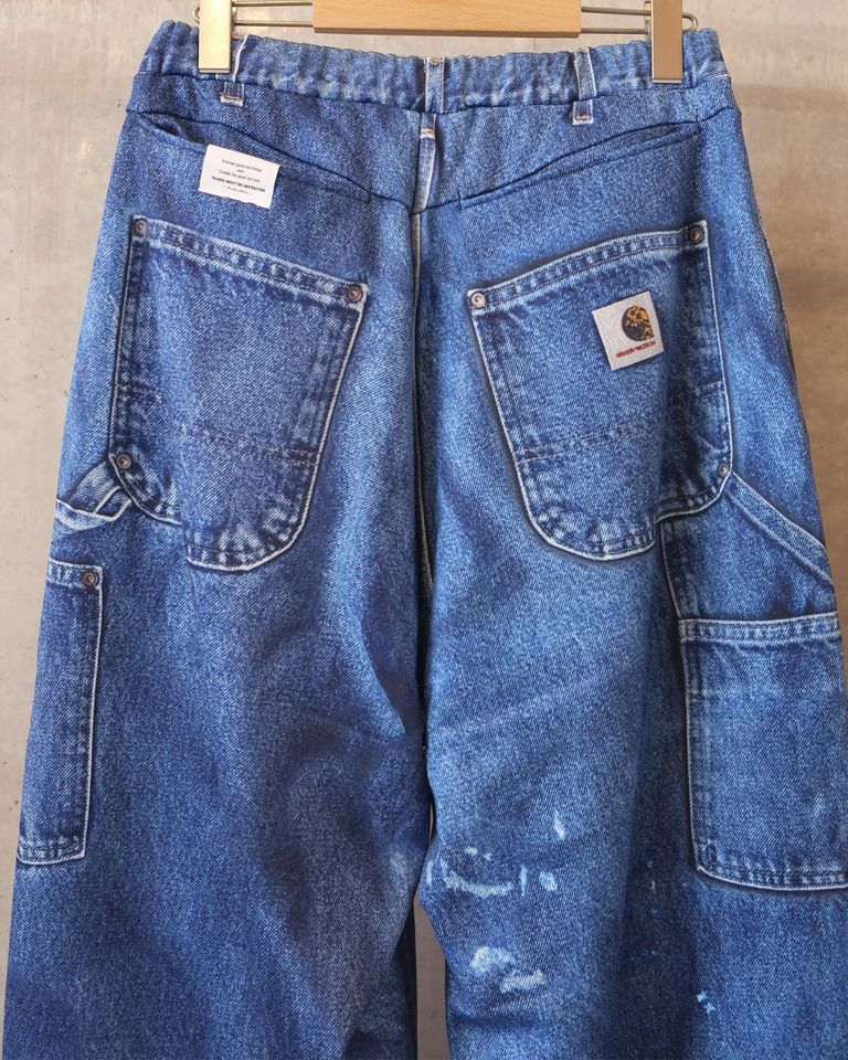 そこにヴィンテージのダックパンツの風合いを転写することで、リアルな色褪せやアタリ、ワーク由来の無骨な表情を視覚的に再現しています。見た目のタフさと、実際の柔らかな穿き心地とのコントラストが際立つ、ブランドらしい一本に仕上がっています。